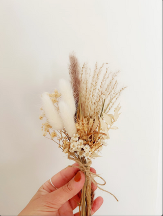 A perfect mix of unique textures and refreshing colors makes this mini dried floral bouquet of small, neutral poppy pods, tan bunny tails, pink peach everlastings, and natural green foliage a favorite for spring. The beautiful botanicals and flowers were grown in a sustainable nursery in Japan and then arranged by hand to create a special bundle just for you.